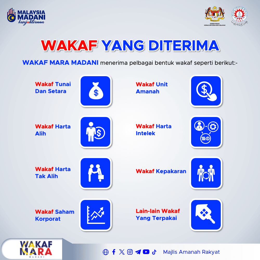 Namun bagi pewakaf yang berhasrat untuk mewakaf 6 kategori harta di atas kepada MARA atas nama Wakaf MARA MADANI haruslah memastikan mempunyai pemilikan sempurna kepada setiap aset yang hendak diwakafkan dan aset tersebut juga haruslah patuh syariah.
